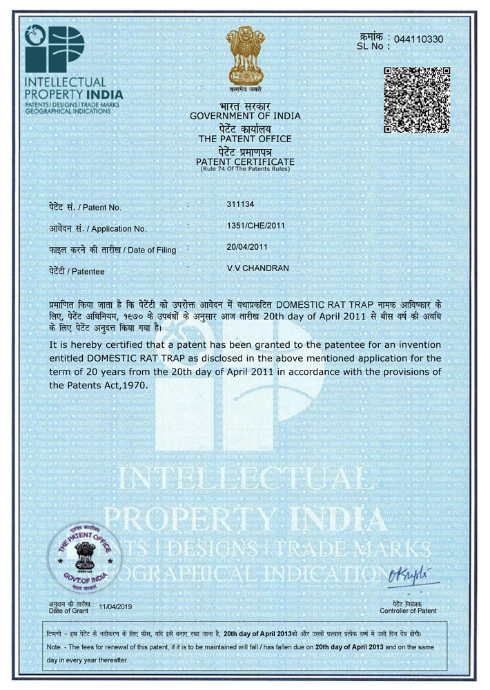 I Chandran V.V Proprietor and inventor have been in this filed for more than 17 Years and making various machineries as per the requirements of individual. After then my thought concentrated into a new machine to eradicate rat problems finally I designed a machine named ‘BLACK CAT’ Rat Trap. When I was invented this machine I tried to getting patent, now this is a patented machine which circulate nationally and internationally.